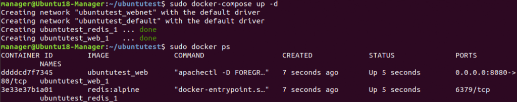 El ejemplo siguiente genera un contenedor (servicio web de apache como hemos creado antes con nuestro «Dockerfile» añadiéndole CMD [«apachectl», «-D», «FOREGROUND»]) y otro del servicio REDIS (Que comprueba el numero de visitas que tiene esa pagina web). El servicio REDIS solo lo vamos a lanzar acomo ejemplo y no nos va ha funcionar adecuadamenbte.