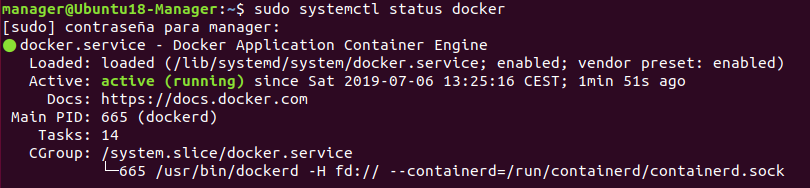 - Para comprobar como esta la version Docker instalada podemos velo con: sudo systemctl status docker y el resultado obtenido es el de la siguiente imagen.