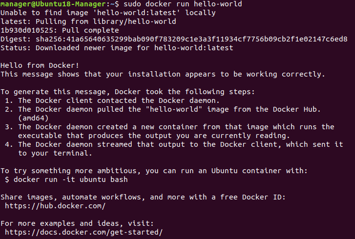 Para comprobar que todo ha ido bien deberíamos descargarnos nuestra primera imagen y ejecutarla con sudo docker run hello-world. EN la siguiente imagen vemos el resultado de la ejecución de dicho comando.